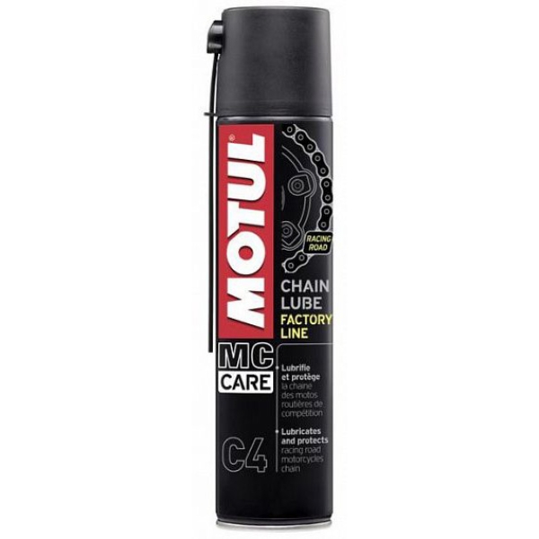 • Наиболее рекомендован для скоростных мотоциклов: MOTUL Chain Lube Factory Line остается на цепи даже на очень большой скорости.