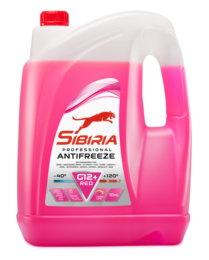 Карбоксилатный Антифриз "SIBIRIA -40 G12+" изготовлен по новейшей технологии органических кислот (Organic Acid Technology) из этиленгликоля высшего сорта и импортного пакета функциональных присадок. Не содержит нитритов, нитратов, аминов, фосфатов, боратов и силикатов. Предназначен для всех современных двигателей, подвергающихся высокой нагрузке, особенно алюминиевых. Антифриз обеспечивает прекрасную защиту системы охлаждения от замерзания, коррозии и перегрева, эффективно защищает от образования отложений.