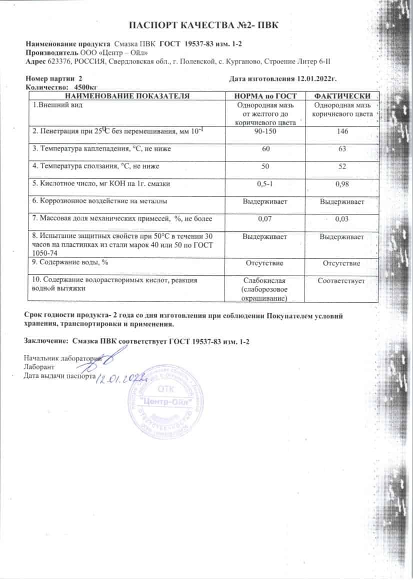 Смазка ЦентрОйл ПВК — это эффективная консервационная защитная смазка, которая представляет собой нефтяное масло, загущённое петролатумом и церезином. Она содержит антикоррозионную присадку, что обеспечивает надёжную защиту металлических изделий от коррозии. Эта смазка производится в соответствии с требованиями ГОСТ 19537-83 и сохраняет свои свойства при температуре от −50 до +50 °C.